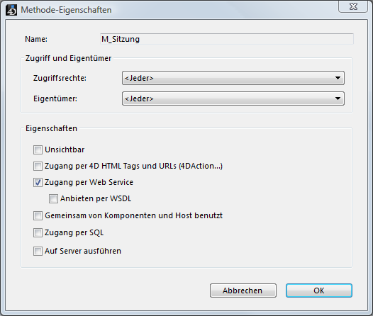 Jede Methode, die veröffentlicht werden soll, muss die Eigenschaft Zugang per Web Service haben. Das legen Sie im Dialogfenster Methode-Eigenschaften fest:
