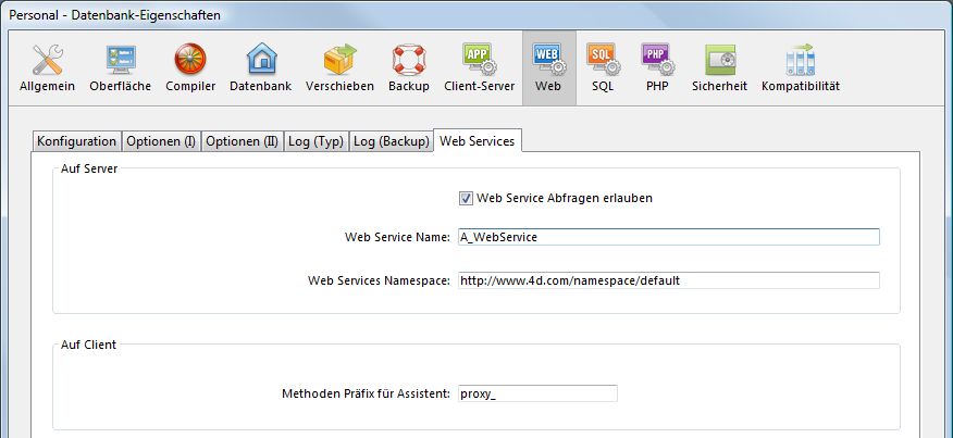 4D verwendet standardmäßig den Namen A_WebService. Sie können ihn in den Datenbank-Eigenschaften auf der Seite Web>Web Services verändern.