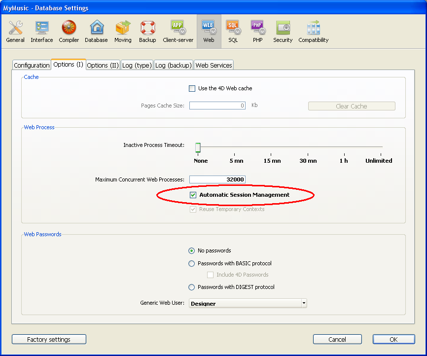 アプリケーションで4Dの自動Webセッション管理を使用するには、その機能が有効化されていなければなりません。