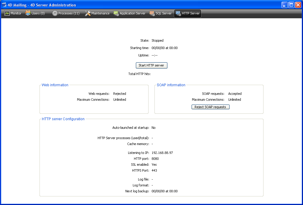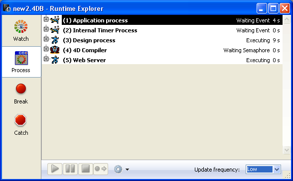 This is a 4D kernel process; you cannot abort this process using the Abort button. Also, you cannot attempt interprocess communication using commands such as CALL PROCESS. Note that the Web Server process does not have any user interface components (windows, menus, and so on).