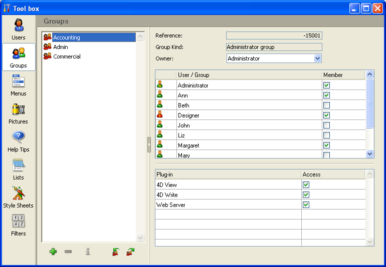 これを行うには、4Dでツールボックスのグループページを表示します (これらのパラメーターを変更する権限を持っていなければなりません)。