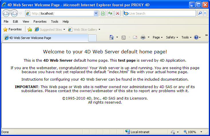 デフォルトでWebサーバーが最初に起動されたとき、4Dは“index.html”という名前のホームページを作成し、HTMLルートフォルダーに置きます。この設定を変更しない場合、Webサーバーに接続するブラウザーには以下のようなページが表示されます: