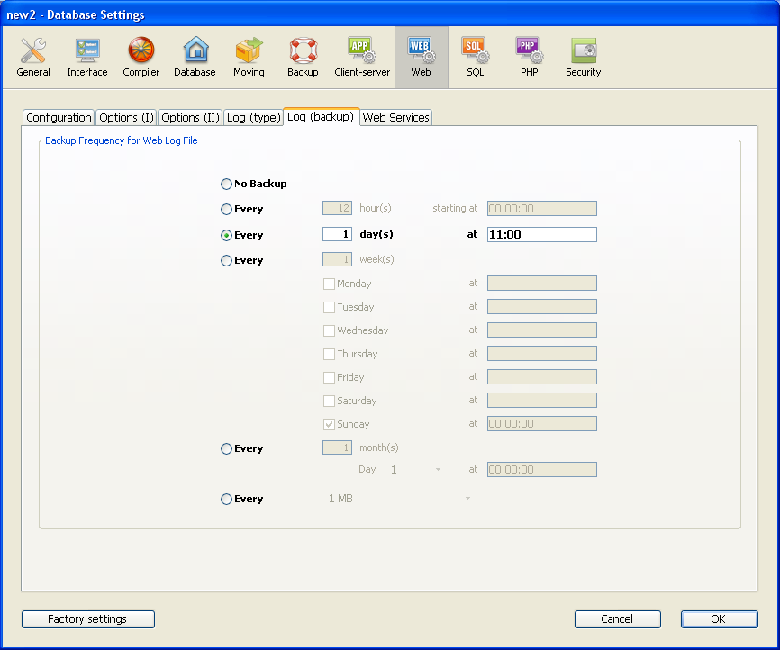 The automatic backup parameters for the request log are set on the Web/Log (backup) page of the Database Settings: