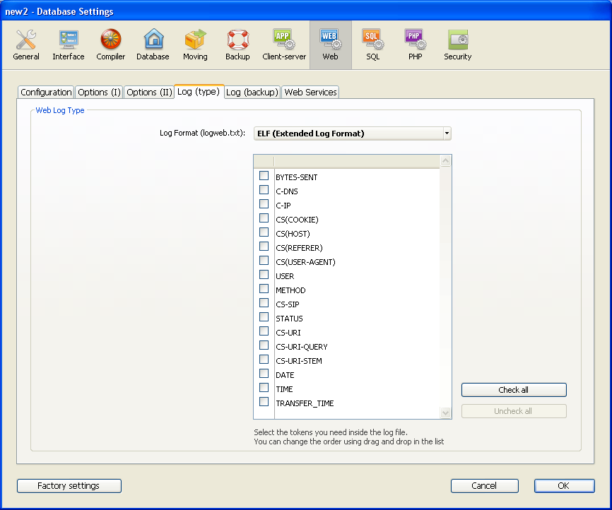 When you choose the ELF (Extended Log Format) or WLF (WebStar Log Format) format, the “Weg Log Token Selection” area displays the fields available for the chosen format. You will need to select each field to be included in the log. To do so, use the arrow buttons or simply drag and drop the desired fields into the “Selected Tokens” area.