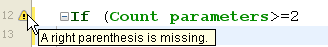 When the method is validated, 4D checks for basic syntax errors and for the structure of the statements (If, End if and so on). 4D also checks for matching enclosing characters in the code such as parentheses or quotation marks. When you type an enclosing character, 4D indicates the match by framing the start/end characters with gray rectangles: