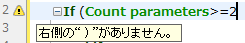 4Dは自動でメソッドシンタックスをチェックします。シンタックスが正しくない状態では、そのことを示す記号がブレークポイントエリアに表示されます