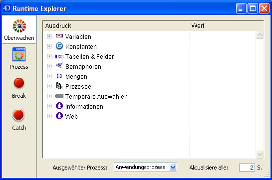Das Fenster Runtime Explorer hat vier Seiten, die Sie über die Icons am linken Rand öffnen können: Überwachen, Prozess, Break und Catch.