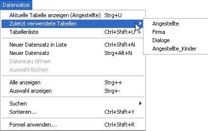 Wählen Sie im Menü Datensätze>Zuletzt verwendete Tabellen eine Tabelle aus.