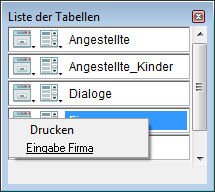 Vor jedem Tabellennamen im Fenster gibt es zwei Icons für Eingabe- und Ausgabeformulare. Der erste Icon zeigt die Eingabeformulare, der zweite Icon die Ausgabeformulare.