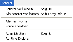 Der obere Teil enthält Standardbefehle zum Verwalten der Arbeitsfenster (die Befehle variieren je nach Plattform). Dieses Menü enthält auch Befehle zum Anzeigen serverspezifischer Fenster.