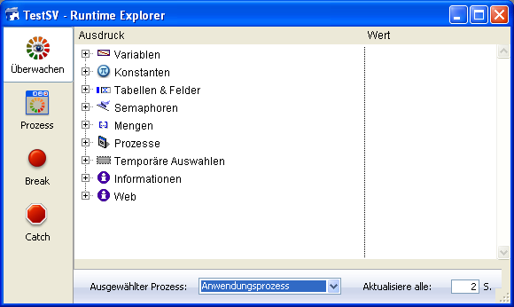 Das Fenster enthält am linken Rand vier Schaltflächen, über die Sie auf die Seiten Überwachen, Prozess, Break und Catch gelangen. Er funktioniert in 4D Server auf dieselbe Art und Weise wie in 4D. Weitere Informationen dazu finden Sie im Handbuch 4D Designmodus im Kapitel Runtime Explorer.
