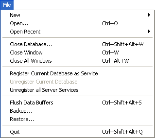 A interface da aplicação 4D Server se compõe dos seguintes menus: Arquivo, Edição, Janela, Ajuda. Em Mac OS, alguns comandos se encontram no menu 4D Server (menu aplicação).