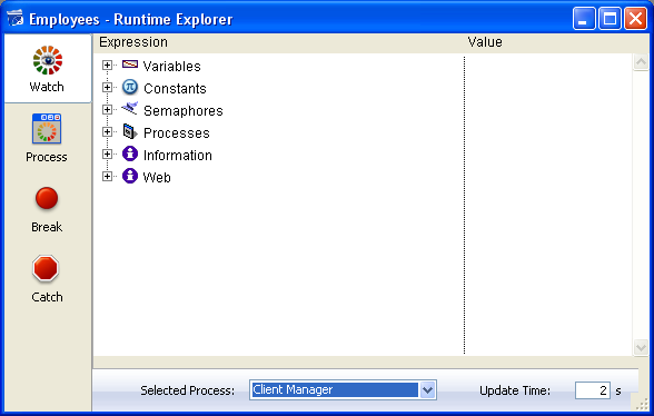 A janela contém quatro páginas, acessíveis através de botões correspondentes: Rastreamento, Processo, Ponto de interrupção e Captura. O funcionamento do Explorador de execução em 4D Server é idêntico ao de 4D. Para obter mais informações, consulte o manual de Desenho.