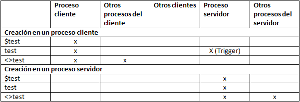 • Conjuntos/selecciones temporales proceso: sólo se puede acceder a un objeto proceso por el proceso en el cual fue creado, si fue creado en un proceso cliente, por el proceso "gemelo" creado en el servidor. Los conjuntos proceso se borran tan pronto como termina la ejecución del método de proceso. Los objetos proceso no necesitan un prefijo particular en el nombre.