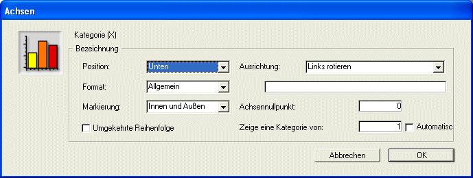 Im Dialogfenster Achsen verändern Sie die Position der Achsenbezeichnungen, der Achsenmarkierungen sowie den Ursprung (Achsennullpunkt). Sie können zudem die Skalierung der Werteachse verändern und die Reihenfolge der auf der Achse dargestellten Werte umkehren: