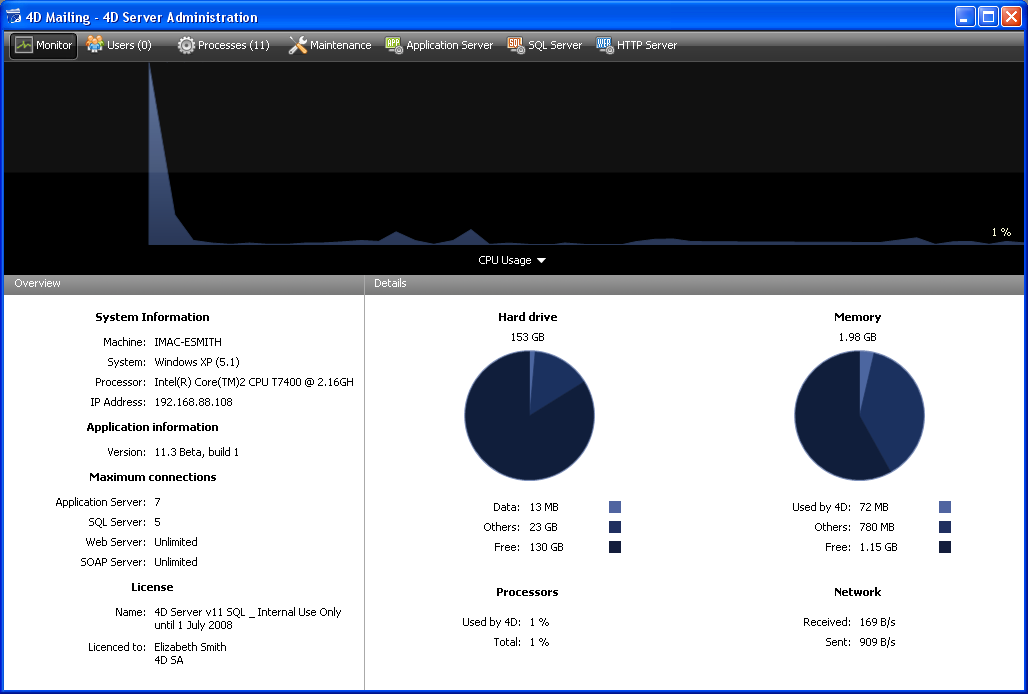 You can administer the 4D Server machine from a remote 4D (client machine) by opening the 4D Server administration window (see the Monitor Page section) on the client machine.