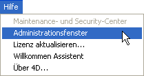 • Wählen Sie im Menü Hilfe den Befehl Administrationsfenster oder klicken Sie in der 4D Werkzeugleiste auf die entsprechende Schaltfläche: