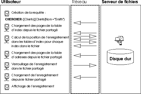 Dans le modèle du partage de fichiers, chaque station de travail effectue en local toutes les actions de modification sur les données. Cela a pour conséquence de créer un trafic réseau très important, car chaque requête nécessite de nombreuses communications à travers le réseau. Le schéma suivant présente un exemple de trafic réseau généré lorsqu'un utilisateur recherche chaque personne dont le nom est “Smith”.