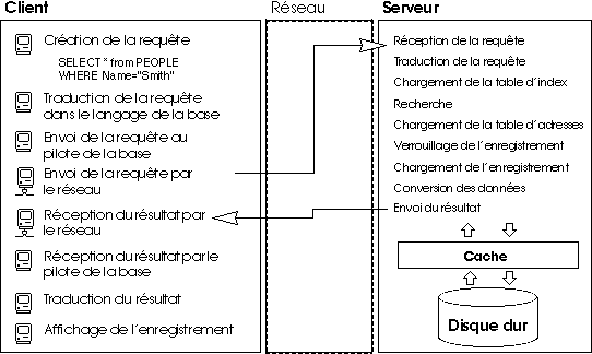 Par exemple, pour rechercher un enregistrement, un client envoie une requête au serveur. Comme la base est stockée sur le serveur, celui-ci exécute la commande en local et expédie le résultat au client. Le schéma suivant présente un exemple de trafic réseau généré lorsqu'un utilisateur recherche chaque personne dont le nom est “Smith” et affiche le premier enregistrement trouvé.