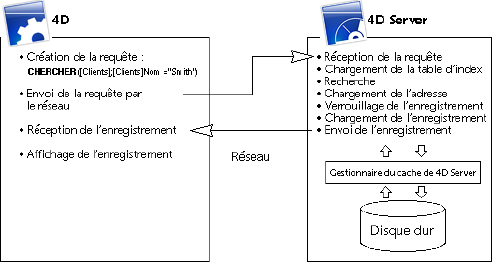 Pour rechercher un ensemble d'enregistrements, par exemple, un poste client envoie une requête au serveur. Dès réception de la requête, 4D Server exécute la recherche en local (c'est-à-dire sur le poste serveur) et, lorsqu'elle est terminée, en retourne le résultat (les enregistrements trouvés).
