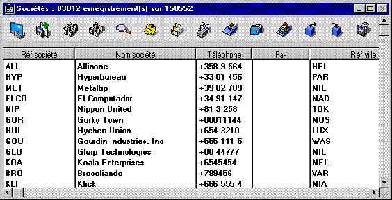 • Au niveau de l'interface utilisateur : Lorsque 4D affiche une liste d'enregistrements, le formulaire utilisé joue un rôle dans l'architecture client/serveur. Par exemple, la fenêtre suivante montre le résultat d'une requête dans la table [Sociétés].