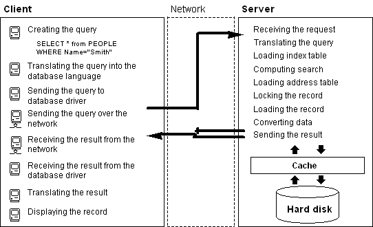 Para pesquisar um conjunto de linhas, por exemplo, um computador cliente envia uma solicitação para o servidor. Uma vez recebido o pedido, o servidor executa a pesquisa no local, ou seja, no computador do servidor, e quando ela termina retorna o resultado (registros encontrados).