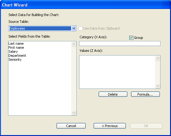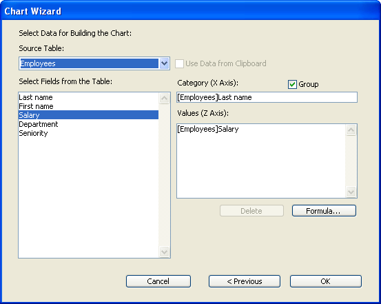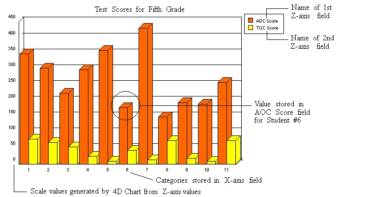 For a two-dimensional graph, you specify a field for the horizontal axis (X-axis) and one or more fields or formulas for the vertical axis (referred to in 4D Chart as the Z-axis).