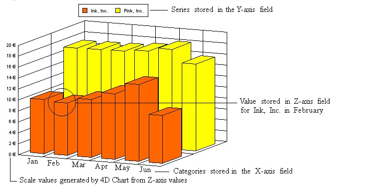 The following example graph shows how 4D Chart uses the information in the database to create a graph. The graph shows the average monthly stock value for two companies. The X-, Y-, and Z-axis fields are, respectively: Month, Company Name, and Average Price.