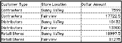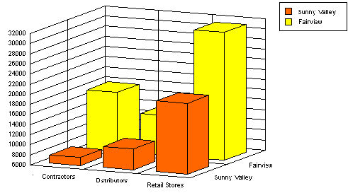 For a three-dimensional graph, you specify one field each for the X-, Y-, and Z-axes. The following illustration shows the spreadsheet data used for the example graph. The information details the total sales by two different stores to three types of customers.