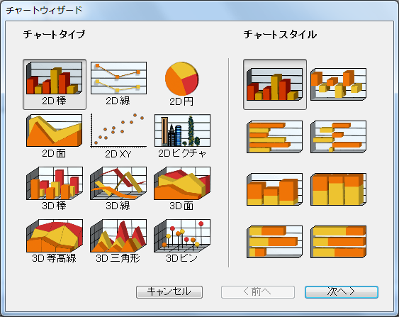 チャートタイプは、いつでも切り替えることができます。任意の二次元グラフタイプから別のタイプへ変更したり、または任意の三次元グラフタイプから別のタイプへ変更することができます。グラフを作成する際、さまざまなチャートタイプを試し、そのデータの表示に最も適しているチャートタイプを見つけてください。