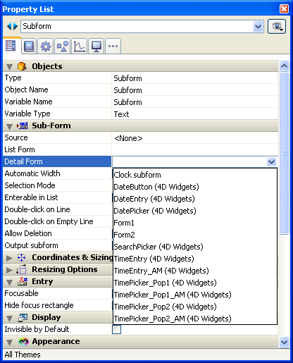 2. Na lista de propriedades, faça clique no menu "Formulário detalhado" com o fim de mostrar a lista de formulários utilizáveis. Esta lista inclui os widgets.