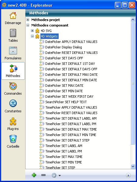 Ces widgets sont utilisables avec ou sans programmation. Vous pouvez les intégrer simplement dans vos formulaires et utiliser leur propriétés par défaut. Si vous souhaitez pouvoir les contrôler et les paramétrer de façon plus personnalisée, il vous suffit de faire appel à des méthodes projet spécifiques, appelées "Méthodes composant". Ces méthodes sont listées par composant dans la page Méthodes de l’Explorateur :