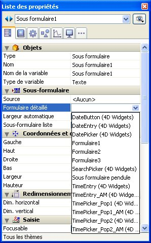 Ce point est décrit dans le manuel Mode Développement de 4D. - Dans la liste des propriétés, déroulez le menu "Formulaire détaillé" afin d'afficher la liste des formulaires utilisables. Cette liste inclut les widgets.