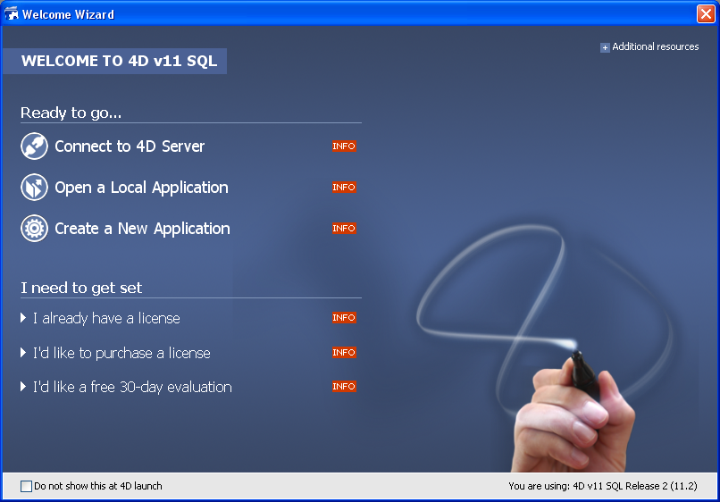 Se este é o primeiro lançamento da aplicação 4D ou se não há modificado os parâmetros de inicio, aparece a caixa de diálogo de boas vindas: