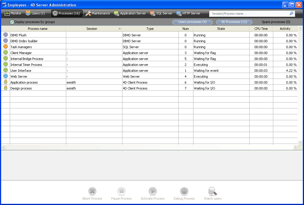 Você pode filtrar a lista de processos exibidos usando os botões Processos usuários, Processos 4D e a área de filtro localizada na parte superior direita da janela de administração.