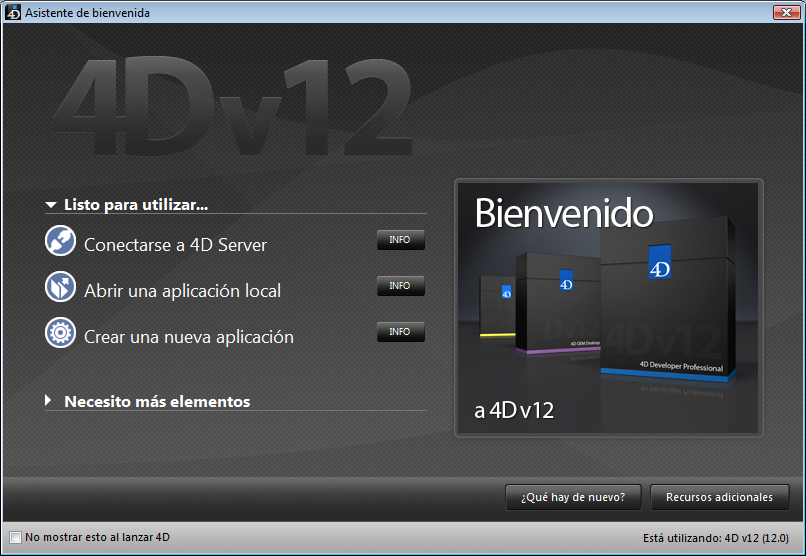 Si este es el primer lanzamiento de la aplicación 4D o si no ha modificado los parámetros de inicio, aparece la caja de diálogo de bienvenida: