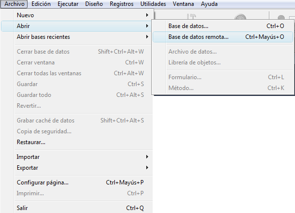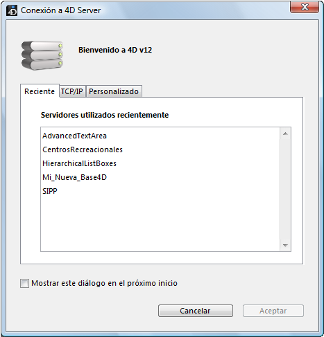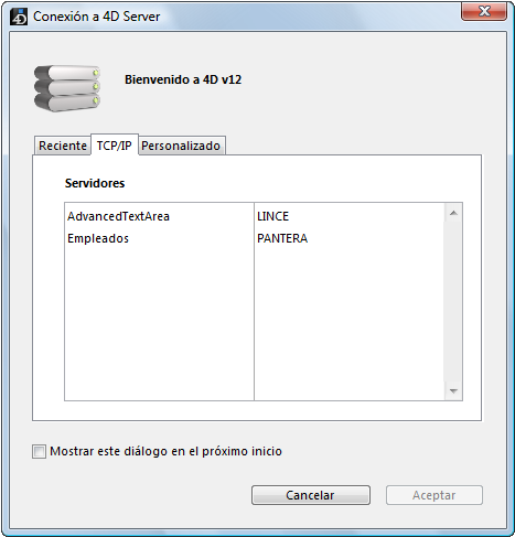 Si no aparece esta caja de diálogo, elija el comando Abrir>Base de datos remota... en el menú Archivo de 4D: