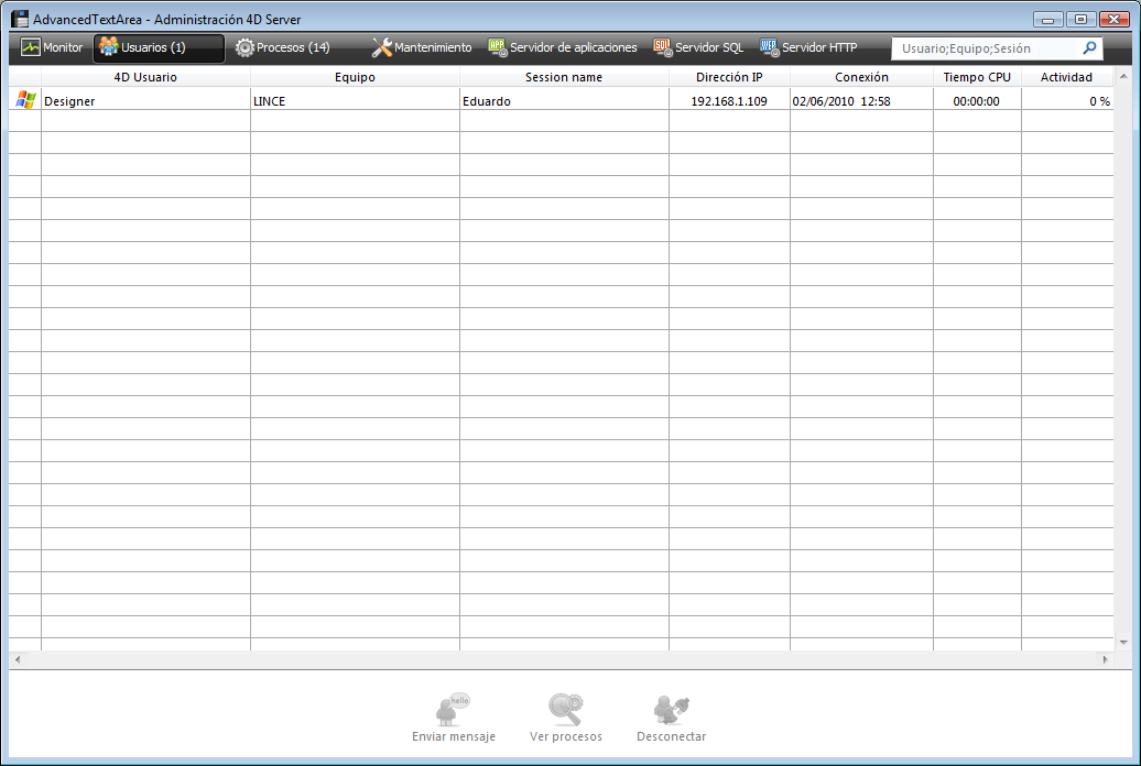 Cuando mira la ventana de administración de 4D Server, puede notar que su nombre de usuario aparece en la página correspondiente, y que el número de usuarios conectados es uno (1).