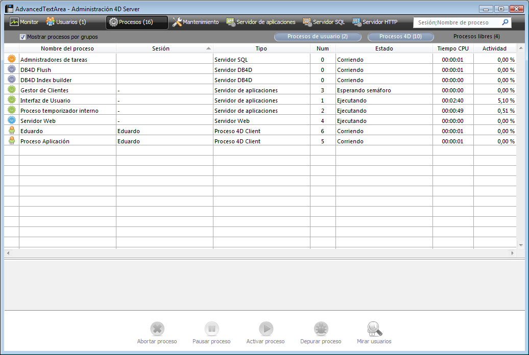 Puede filtrar la lista de procesos mostrados utilizando los botones Procesos usuarios, Procesos 4D y el área de filtro ubicada en la parte superior derecha de la ventana de administración.