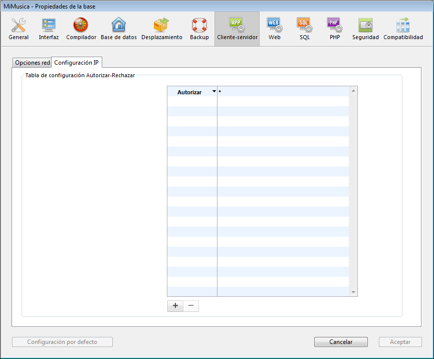 Por defecto, no se aplican restricciones de conexión por 4D Server: la primera línea de la tabla contiene la etiqueta Autorizar y el carácter * (todas las direcciones).