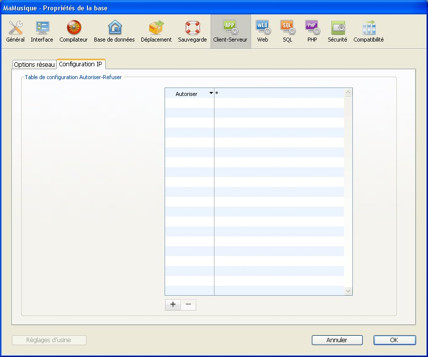 Cette table vous permet de définir des règles de contrôle d’accès à la base en fonction de l’adresse IP des postes 4D distants. Cette option permet de renforcer la sécurité par exemple pour des applications stratégiques.