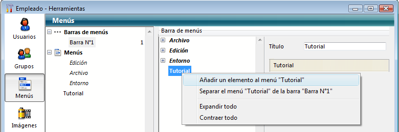 4. Haga clic derecho en el título “Tutorial” y elija el comando Añadir un elemento al menú "Tutorial":