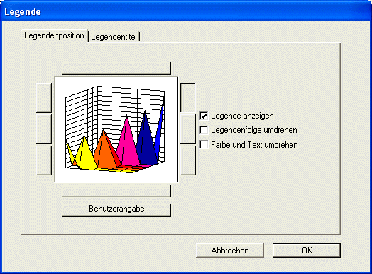 Die Legende ist ein Teil des Diagrammobjekts. Sie können die Legende an einer der acht vorgegebenen Positionen ausgeben oder sie mit der Maus verschieben. So lässt sich die Legende an eine beliebige Stelle im Diagramm setzen, und auch direkt im Diagramm anzeigen. Auch die vertikale oder horizontale Ausrichtung ist möglich, d.h. die Einträge in der Legende können von links nach rechts oder von oben nach unten erscheinen.