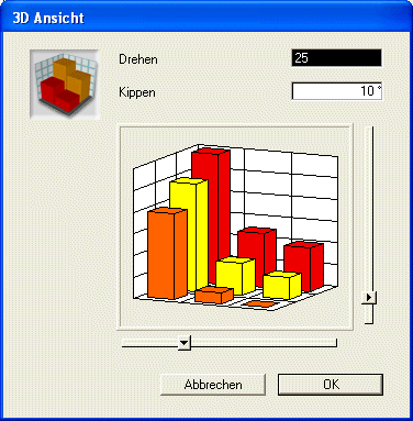 Wählen Sie das 3D Diagramm aus und dann im Menü Diagramm>Ansicht. Auf dem Bildschirm erscheint das Dialogfenster 3D Ansicht: