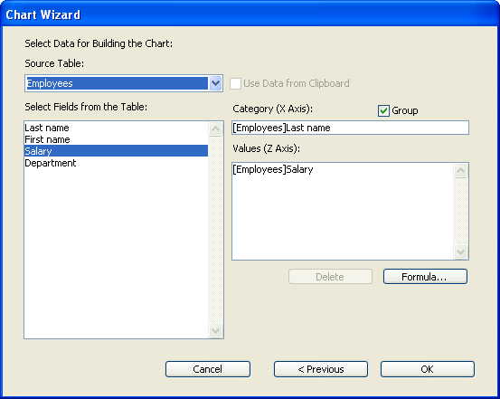 3. Drag and drop the field Last Name to the area Categories (X Axis) and the field Salary to the list Values (Z Axis):