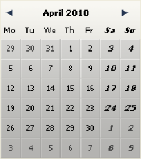 DatePickerカレンダは日付を月ごとに表形式で表示するエリアです。実行中、ユーザーは矢印ボタンをクリックすることでカレンダの月を前後に移動することができます。キーボードの矢印キーを使用することもできます。
