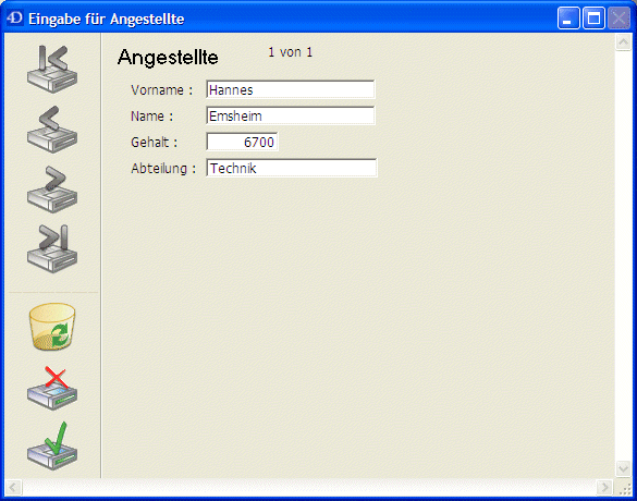 Haben Sie den letzten Datensatz eingegeben, klicken Sie auf Abbrechen (Icon mit Kreuz am linken Rand), um das neue Leerformular zu annullieren. 4D Server kehrt zum Ausgabeformular zurück.