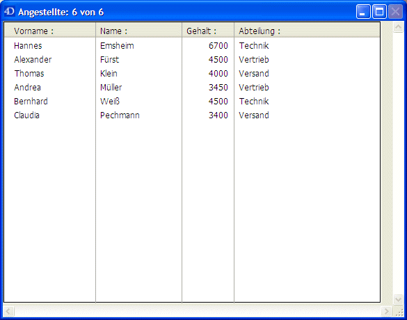 Die Anfrage wird an den 4D Server gesendet, 4D Server sendet das Ergebnis an den Client zurück. Im Ausgabeformular erscheinen nur die Angestellten der Abteilung Technik.