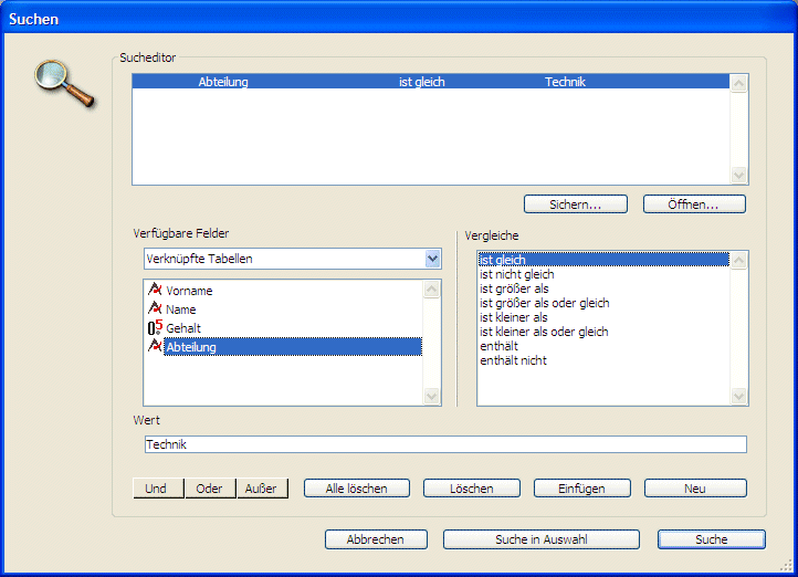 2. Klicken Sie im Bereich Verfügbare Felder auf "Abteilung", in der Liste Vergleiche auf “ist gleich” und geben Sie im darunterliegenden Bereich Wert "Technik" ein.