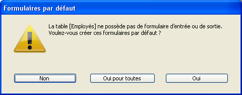 Vous affichez alors la fenêtre des enregistrements. 4D détecte que la table ne dispose d'aucun formulaire et vous demande si vous voulez laisser le programme les créer pour vous.